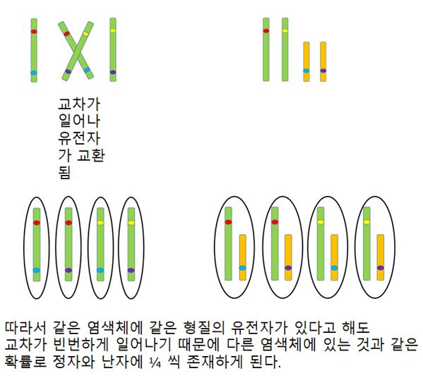 1번 염색체에 있는 두 형질(‘콩 색깔’, ‘꽃 색깔’)은 같은 염색체에 있지만, 거리가 매우 멀리 떨어져 있어서 교차가 활발하게 일어났습니다.