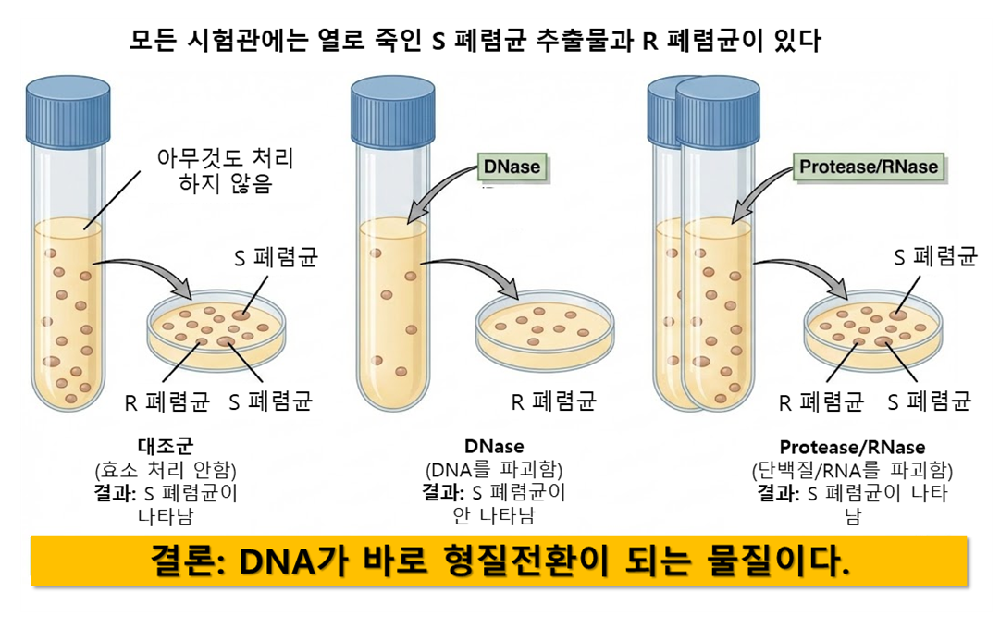 의미: 단백질이나 RNA가 파괴되어도 형질전환은 여전히 일어납니다. 이는 단백질과 RNA는 형질전환을 일으키는 물질이 아님을 보여줍니다. (결과: S 폐렴균 출현)