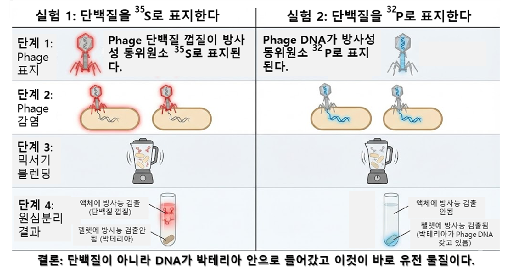 Phage 껍질(단백질/황)은 밖에 버려졌고, 박테리아 안으로 뚫고 들어간 것은 오직 DNA(인)였습니다.
